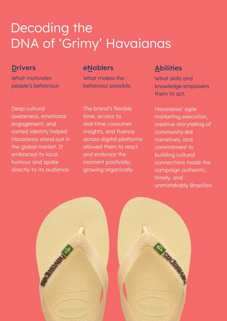 Taking a step back to decode this: Havaianas’ viral success with the “Encardida” flip-flops was driven by its deep cultural awareness, emotional engagement, and rooted identity. This could be seen as the key Driver that helped the brand stand out in a global market by embracing local humour and speaking directly to its audience.
