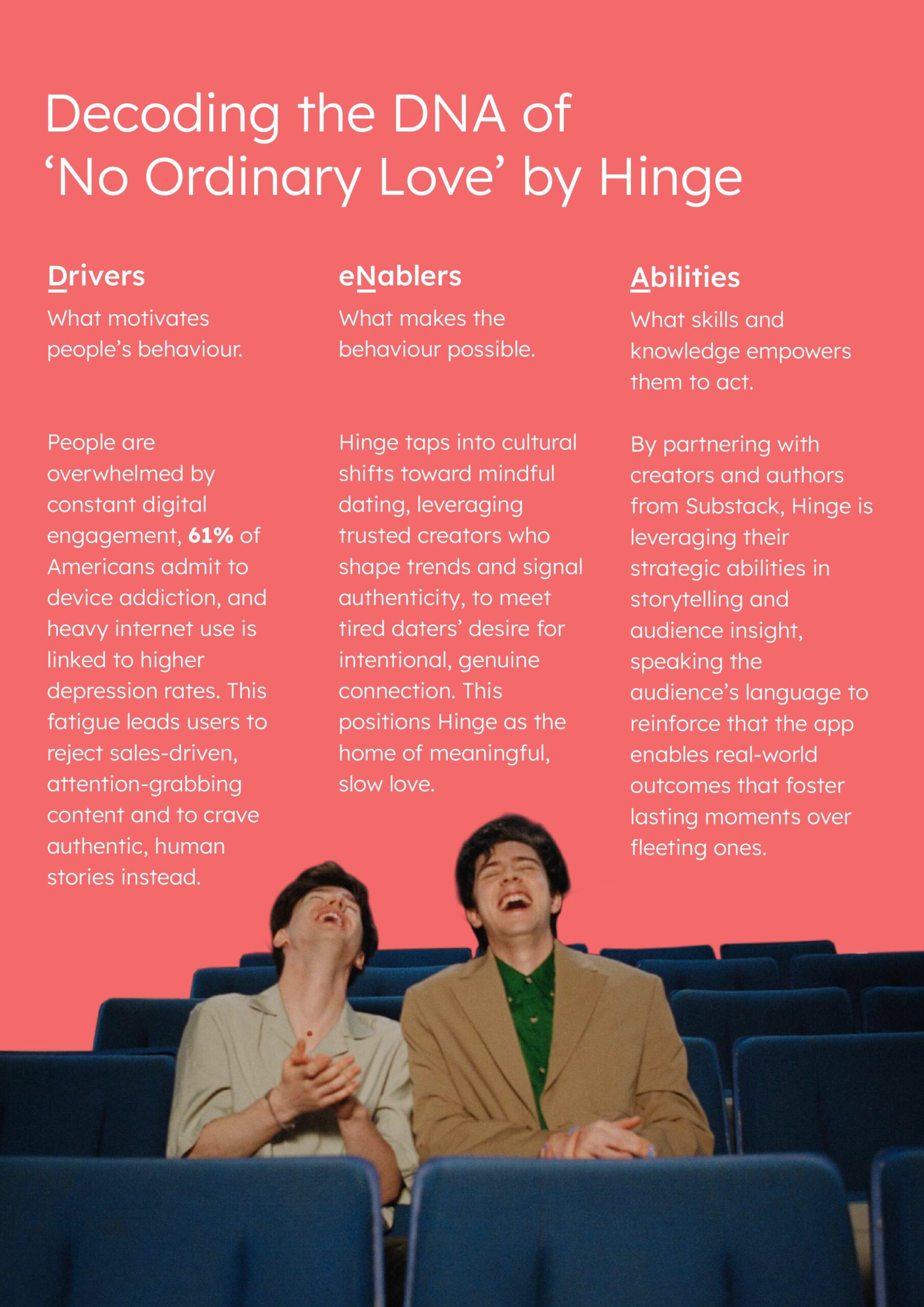 By recognising how its own technology had helped create the very emotional fatigue its audience was feeling, Hinge was able to distance itself from the transactional ‘swipe culture’ and reframe its purpose around meaningful human connections. Not by shouting louder, but by shifting mediums, telling richer stories, and meeting its audience where their romantic imaginations already live.