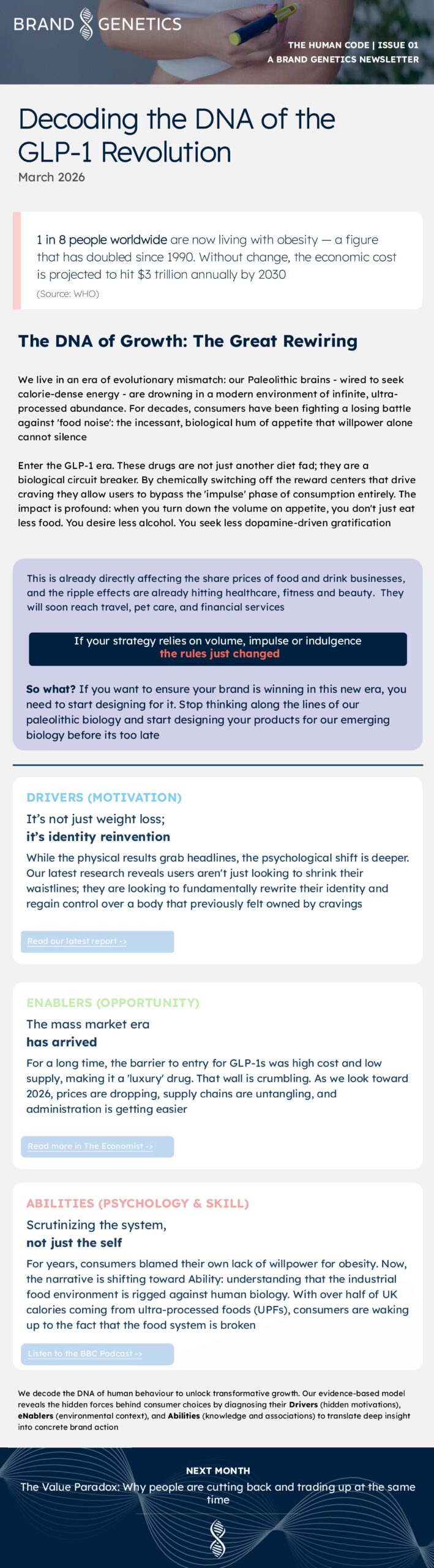 Most business strategy relies on flawless logic, which is precisely why it fails in a real world governed by delightfully irrational human behaviour. Welcome to the new Brand Genetics Newsletter – your monthly antidote to spreadsheet-think, dedicated to revealing the true human motivations that unlock brand growth.